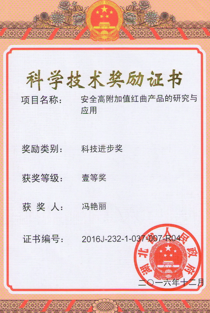 冯艳丽博士的研究成果“安全高附加值红曲产品的研究与应用”获湖北省科技进步一等奖。