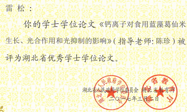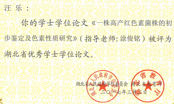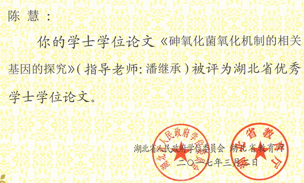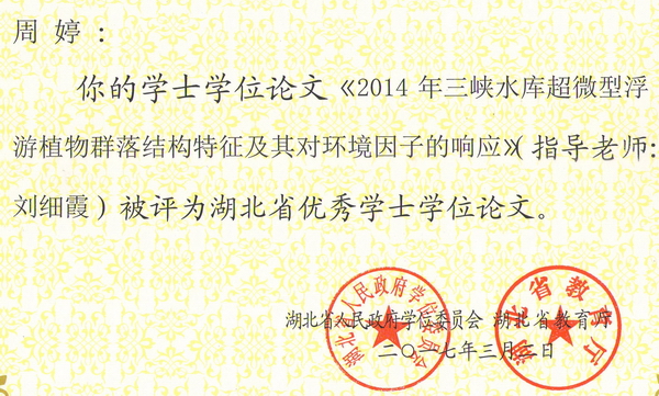 2016年省优学士学位论文证书