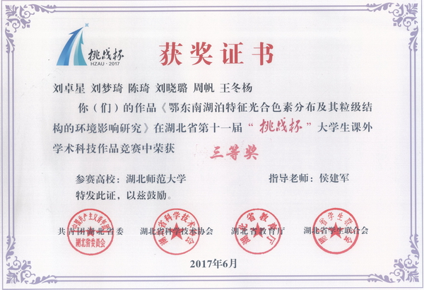 6月9日,湖北省第十一届“挑战杯”大学生课外学术科技作品竞赛在华中农业大学落下帷幕。我院刘卓星、刘梦琦、陈琦、刘晓璐、周帆和王冬杨等同学的作品《鄂东南湖泊特征色素分布及其粒级结构的环境影响研究》(指导教师:侯建军)荣获三等奖。