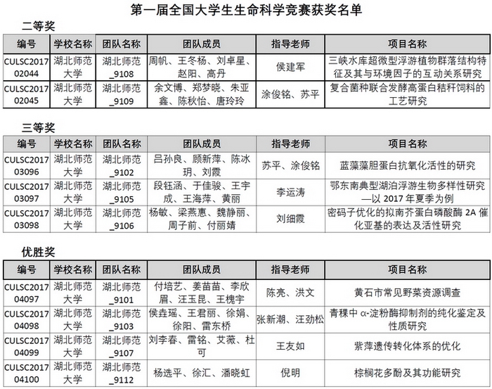 “第一届全国大学生生命科学竞赛”由教育部高校生物科学类专业教学指导委员会、教育部高校生物技术与生物工程类专业教学指导委员会、教育部大学生物学课程教学指导委员会和《高校生物学教学研究(电子版)》杂志于2017年4—11月举办。共有来自全国27个省(市、自治区)的263所高校1903支队伍提交了项目。经过相关学科专家公开、公平、公正的网络评审和现场答辩评审,主办方核实、审定和公示,最终评选出一等奖50名、二等奖150名、三等奖300名以及优胜奖300名。