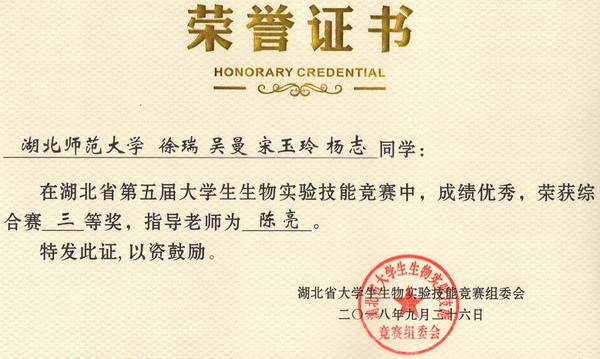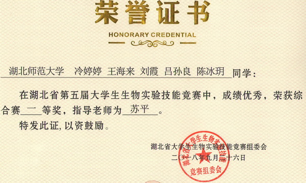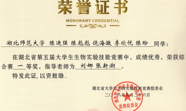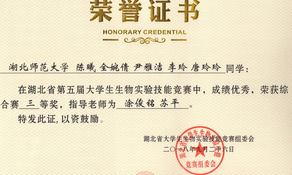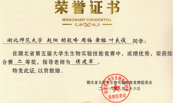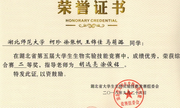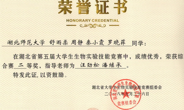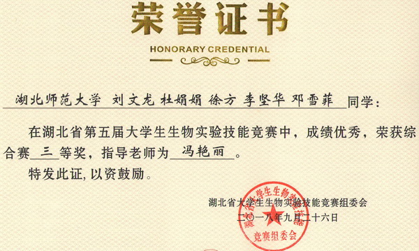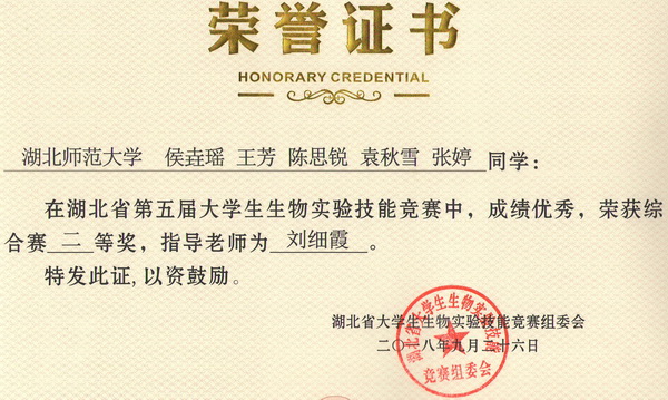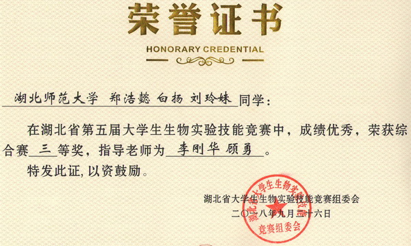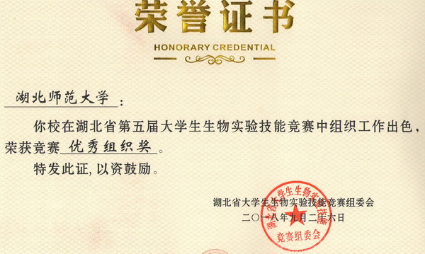 第五届湖北省大学生生物实验技能竞赛综合赛获奖证书