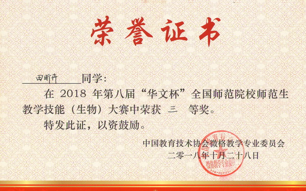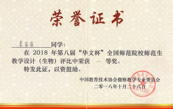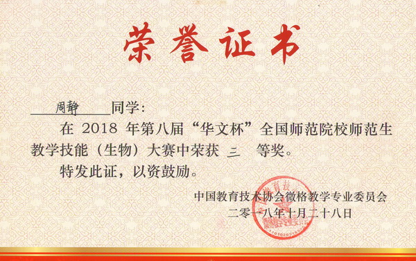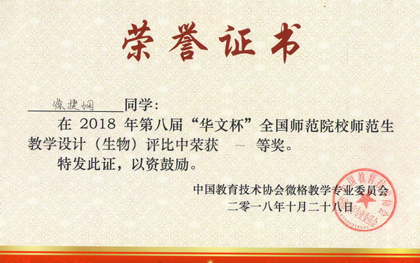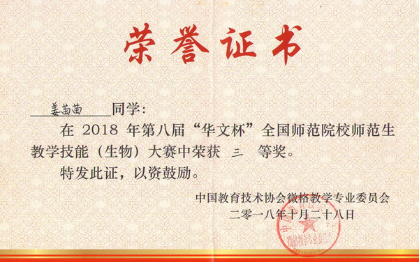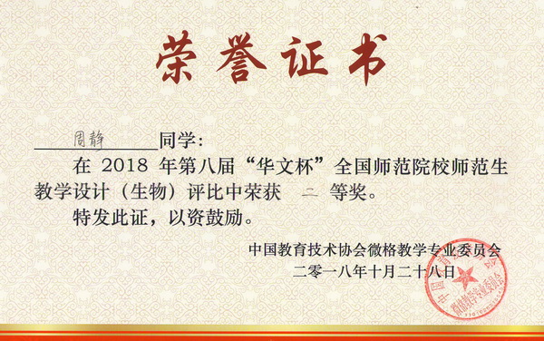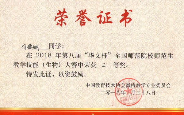 2018年10月27日至28日,由中国教育技术协会微格教学专业委员会主办,南京晓庄学院承办的中国教育技术协会微格教学专业委员会第二十一届年会暨第八届“华文杯”全国师范院校师范生教学技能大赛在江苏省南京市举行。来自北京师范大学、华中师范大学、南京师范大学、湖南师范大学和我校等全国106所高校的628名选手参加了本届大赛,其中生物学科参赛选手349名。