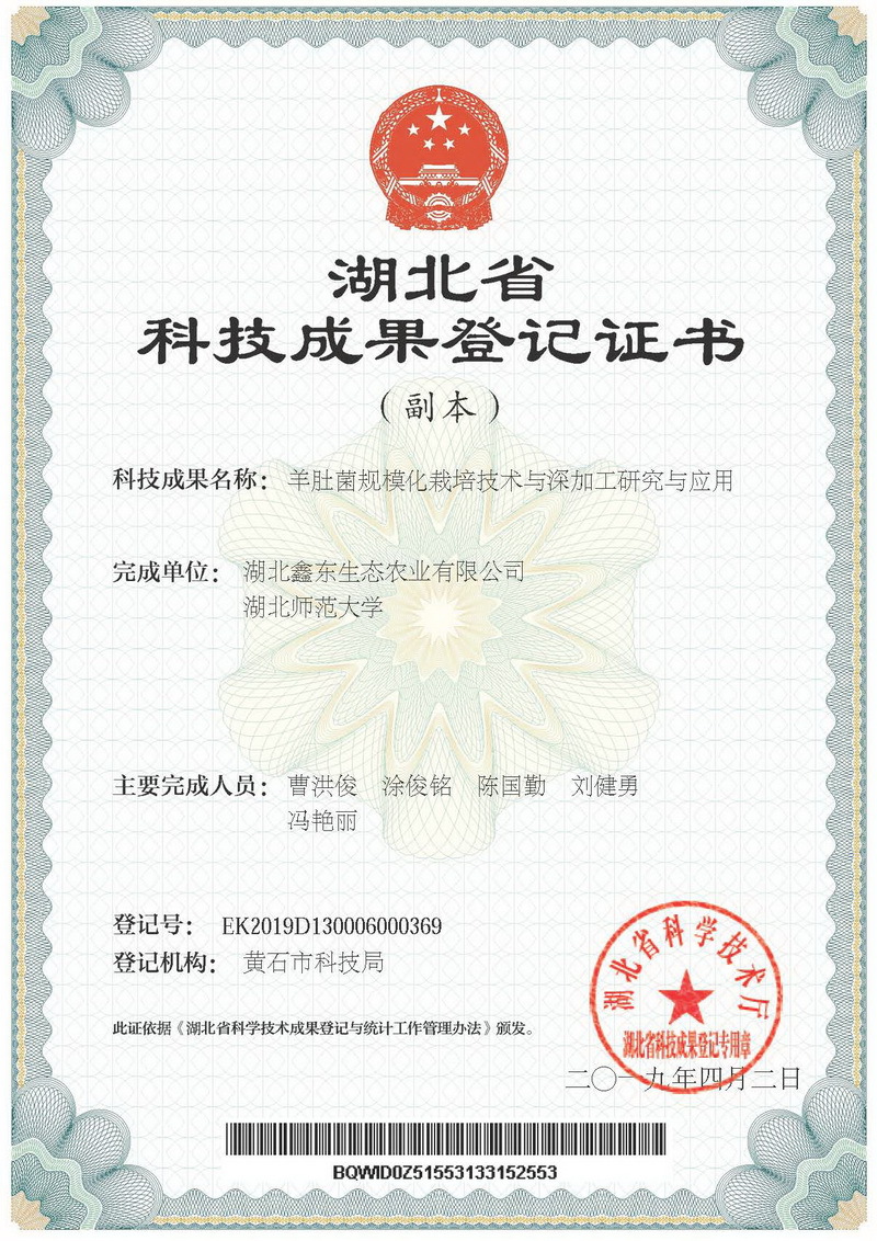 [科技成果登记证书]羊肚菌规模化栽培技术与深加工研究与应用