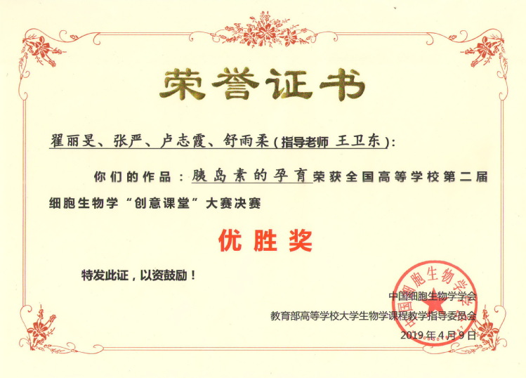 全国高校第二届细胞生物学“创意课堂”大赛决赛优胜奖