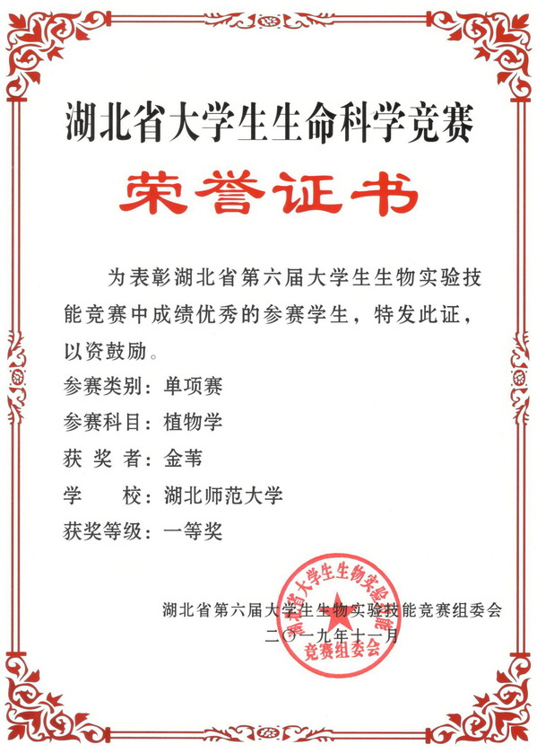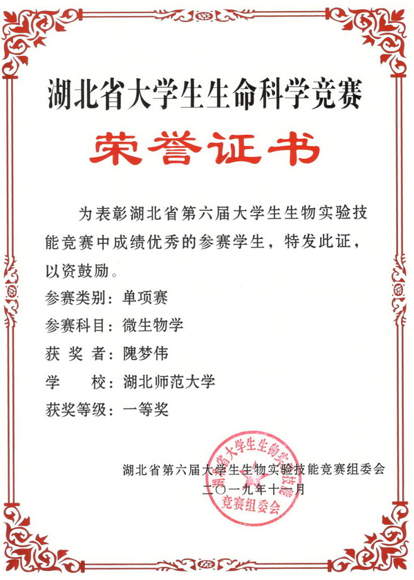 2019湖北省大学生生命科学竞赛单项赛获奖证书(学生)