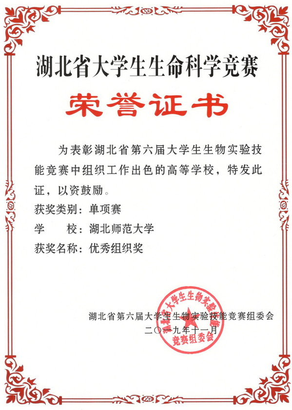 2019湖北省大学生生命科学竞赛单项赛优秀组织奖