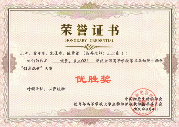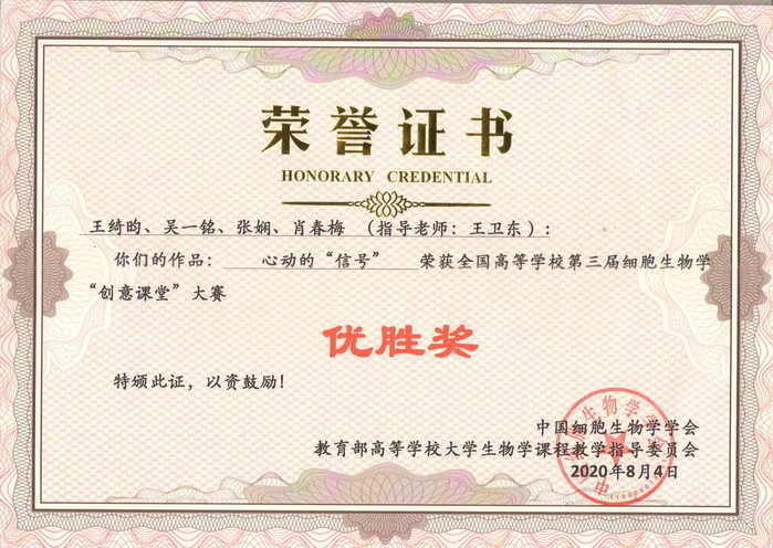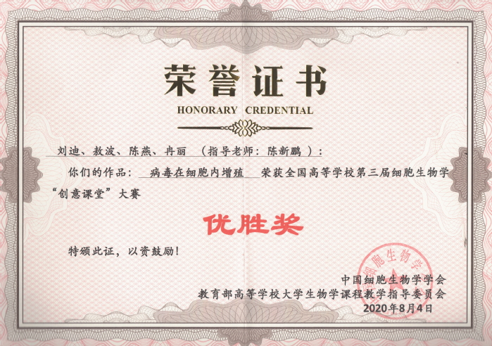 全国高校第三届细胞生物学“创意课堂”大赛获奖证书