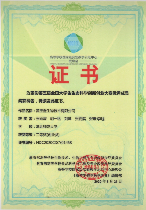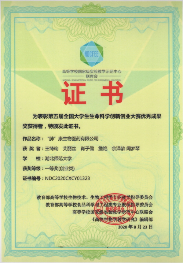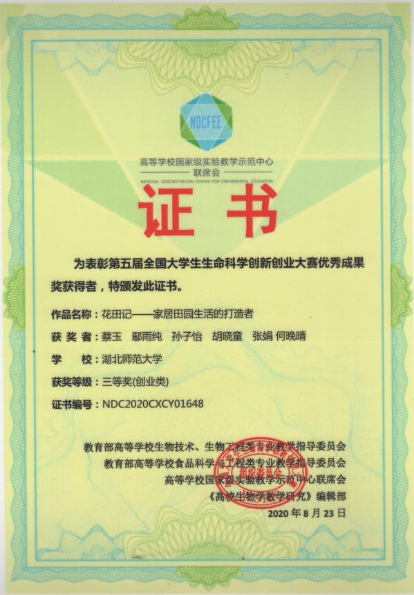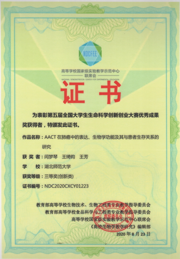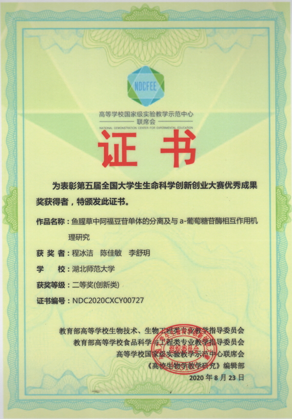 第五届全国大学生生命科学创新创业大赛获奖证书(学生)