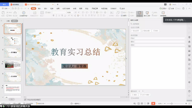 会议第四项,学生代表1701班廖紫微发言,她说明了实习的大概情况,讲述自己如何从听课中总结教育经验,学习如何备课。她也说了自己所存在的问题,对教材的挖掘能力、教学经验、语言表达能力还需提高。最后,她对学校为大家提供的这次实习机会表示感谢。也希望自己早日成为一名优秀的人民教师。