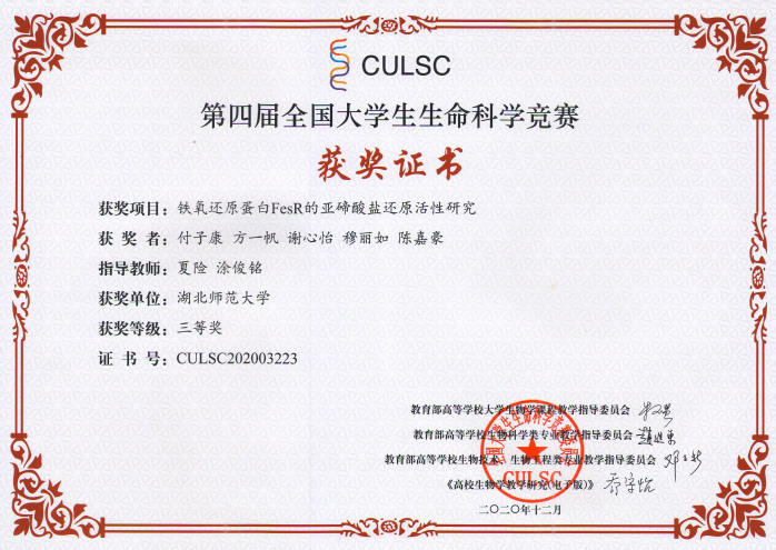 第四届全国大学生生命科学竞赛获奖证书