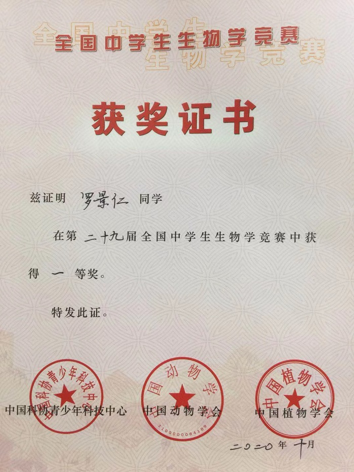 我院培训的黄石二中罗景仁同学荣获第29届全国生物学竞赛一等奖