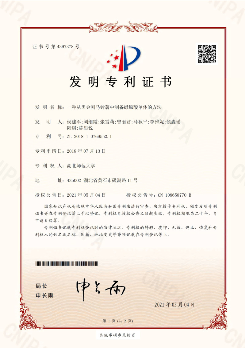 侯建军教授科研团队致力于食用野菜中功能因子挖掘和安全性评价。近年来系统研究了可食用植物中功能因子的提取、分离、结构鉴定及生物活性。特别是在与生物大分子的相互作用及体内外降血糖活性物质挖掘方面开展了系列研究工作。在活性小分子物质分离纯化研究领域取得了阶段性成果,“一种从黑金刚马铃薯中制备绿原酸单体的方法”喜获国家授权发明专利。该专利为绿原酸相关的药物及添加剂开发提供了有力技术支撑。