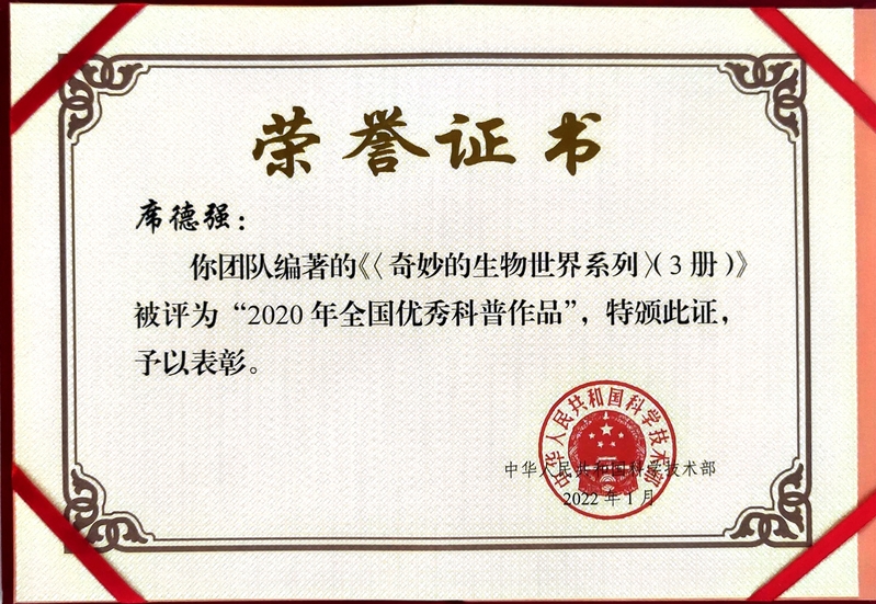 席德强教授编著的《奇妙的生物世界》系列(共3册)被科技部评选为2020年全国优秀科普作品。本次评选全国共有100册(套)科普作品获奖。这是他本人继《改变世界的一粒种子——记杂交水稻之父袁隆平》之后第二次获此殊荣。