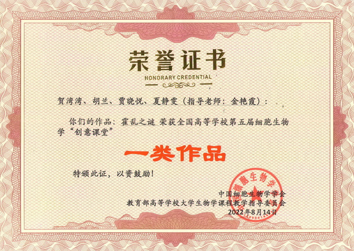 全国高校第五届细胞生物学“创意课堂”大赛获奖证书