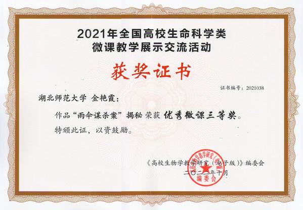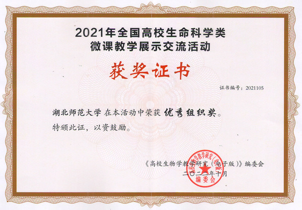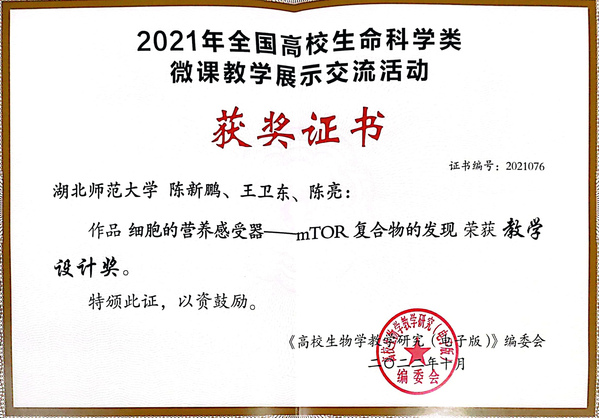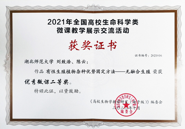近日,2021年全国高校生命科学类微课教学比赛结果揭晓,我院刘致浩、陈云两位博士的作品《有性生殖植物杂种优势固定方法——无融合生殖》荣获二等奖,金艳霞博士的作品《“雨伞谋杀案”揭秘》荣获三等奖,陈新鹏博士的作品《细胞的营养感受器—mTOR复合物的发现》荣获教学设计奖。我校在本活动中荣获优秀组织奖。