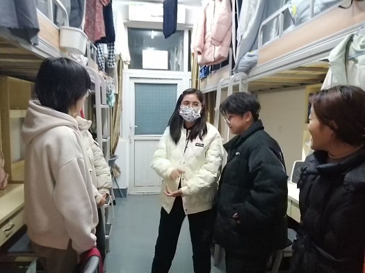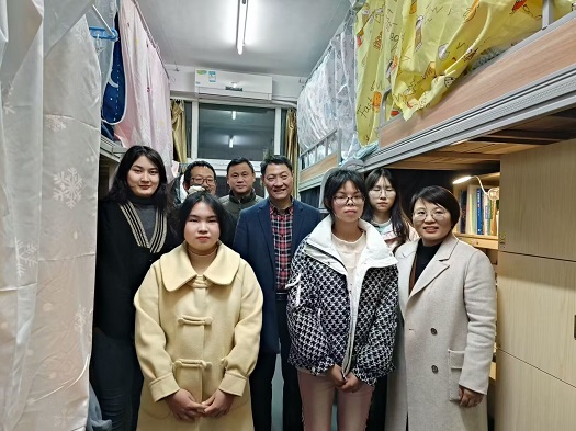 在走访宿舍过程中,校领导及各位老师全面了解学生假期生活以及返校情况,同时关切学子的思想状况。在逐步深入的交流中,老师们认真聆听学生的心声并给予相关建议,同时希望同学们尽快进入学习状态,为新学期制定学习计划与目标。余校长强调,目前疫情形势趋向平稳,但同学们仍需保持健康防护意识,减少出校次数。在走访毕业生宿舍时,老师们十分关心同学们考研和实习就业等的情况,勉励大四学子努力奋进,以激情为船帆、勤苦为船桨,实现高质量就业。