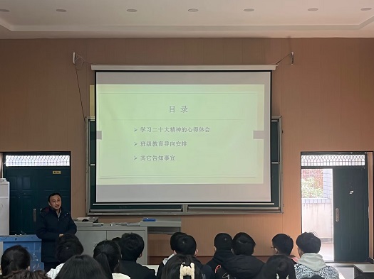 班会伊始,由余翔老师进行发言,他强调了同学们要积极学习党的二十大精神,提升思想觉悟。之后,他就健康安全进行了说明,并提醒同学注意个人防护,有任何问题及时上报学工办。接着,他总结了同学们在上学期的表现,鼓励同学们积极参加校院活动,全面发展自我。随后,他希望同学们调整好学习的节奏,做到劳逸结合。最后,班委们分别从安全教育、心理健康等角度提醒同学们提高个人安全意识,倡导同学们勇于提出问题、表达内心困惑,并与大家一同解决,携手构建和谐班级。