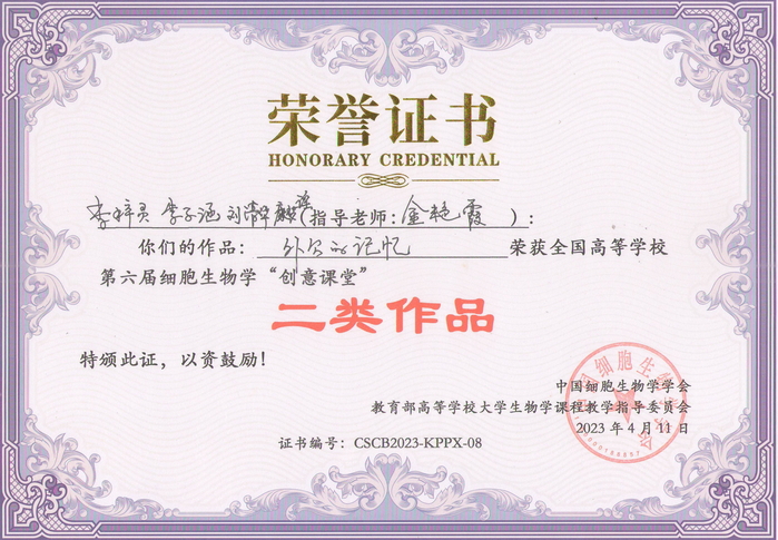 全国高校第六届细胞生物学“创意课堂”大赛获奖证书