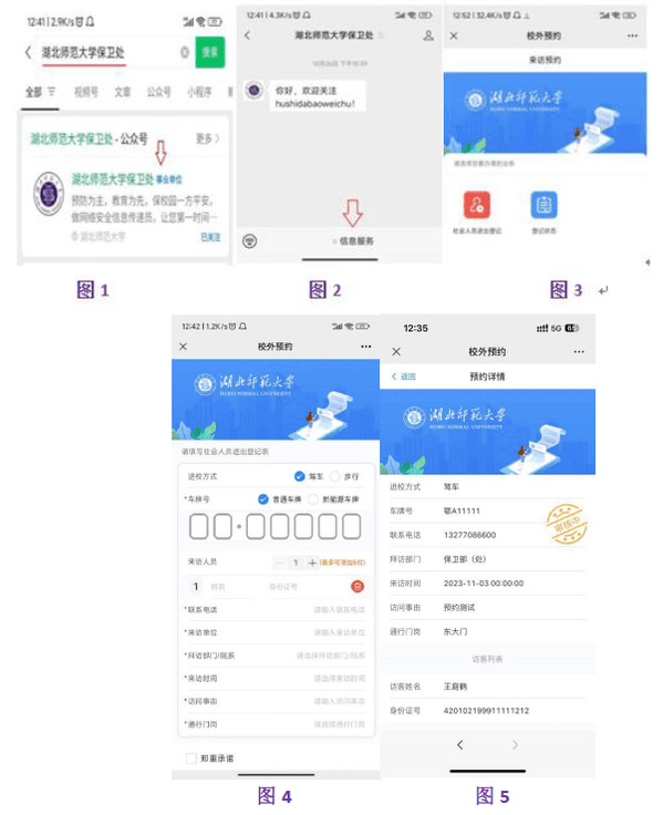 (2)进入公众号,点击“信息服务-预约进校”菜单;(图2)