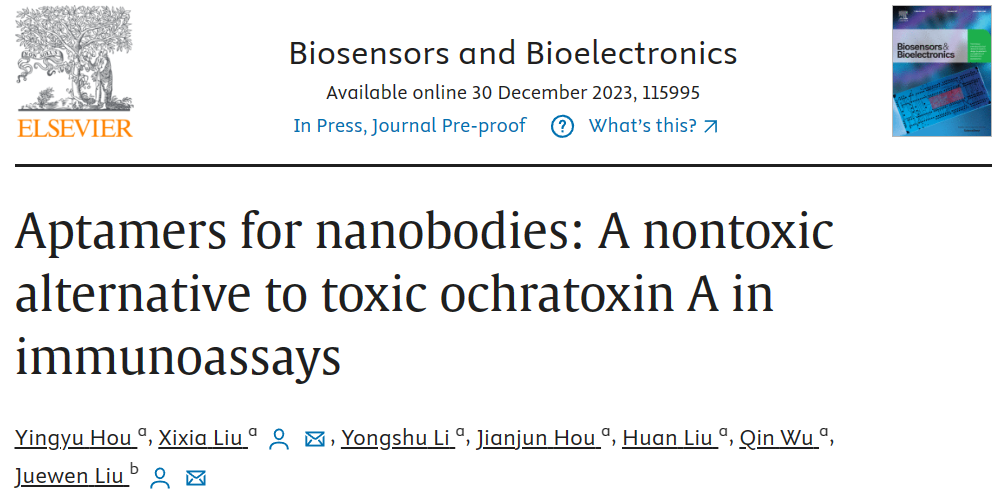 2023年12月,我院刘细霞副教授团队与滑铁卢大学刘珏文教授合作在生物学Top期刊《BIOSENSORS & BIOELECTRONICS》(中科院1区,IF: 12.6)发表题为“Aptamers for Nanobodies: a Nontoxic Alternative to Toxic Ochratoxin A in Immunoassays”的研究性论文。我院2021级硕士研究生侯莹钰为第一作者,通讯作者为我院刘细霞副教授和滑铁卢大学刘珏文教授。