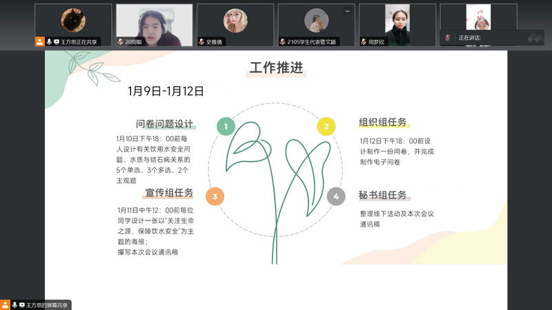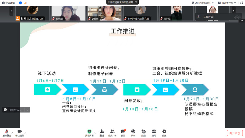 会议伊始,队长王方思介绍了此次寒调活动的大致流程计划,包括活动的成员分组、任务分工、时间安排等,让队员们对此次活动有了基本的了解。随后,她拟定了问卷方向,对近期工作做出详细安排,为队员指明了方向。通过队长的介绍,队员们对整个活动有了更加清晰的认识,为后续工作的开展做了铺垫。最后,王方思强调了团队合作的重要性,同时希望全体队员能够相互帮助、密切配合,共同完成各项任务。