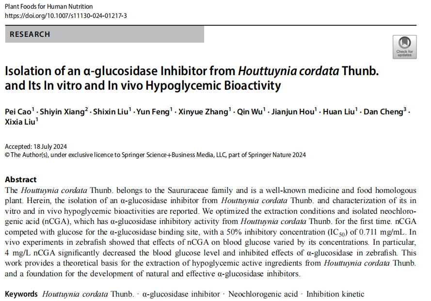 2024年8月,我院刘细霞副教授团队在《Plant Foods for Human Nutrition》(中科院2区)发表题为“Isolation of an α-glucosidase Inhibitor from Houttuynia cordata Thunb.and Its In vitro and In vivo Hypoglycemic Bioactivity ”的研究论文。我院2019级本科生曹佩、刘世昕,以及劲牌研究院工程师向诗银为并列第一作者,我院刘细霞副教授为独立通讯作者。