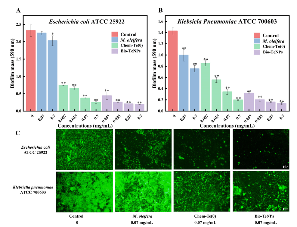 图1.生理盐水、辣木提取物、Chem-Te(0)和Bio-TeNPs对大肠杆菌(A)和肺炎克雷伯菌(B)生物膜形成情况,生物膜FITC染色观察(C);所有数据均以平均值±标准差(SD)的形式表示三个独立重复。*为显著性(p < 0.05);**表示极显著性(p < 0.01)。