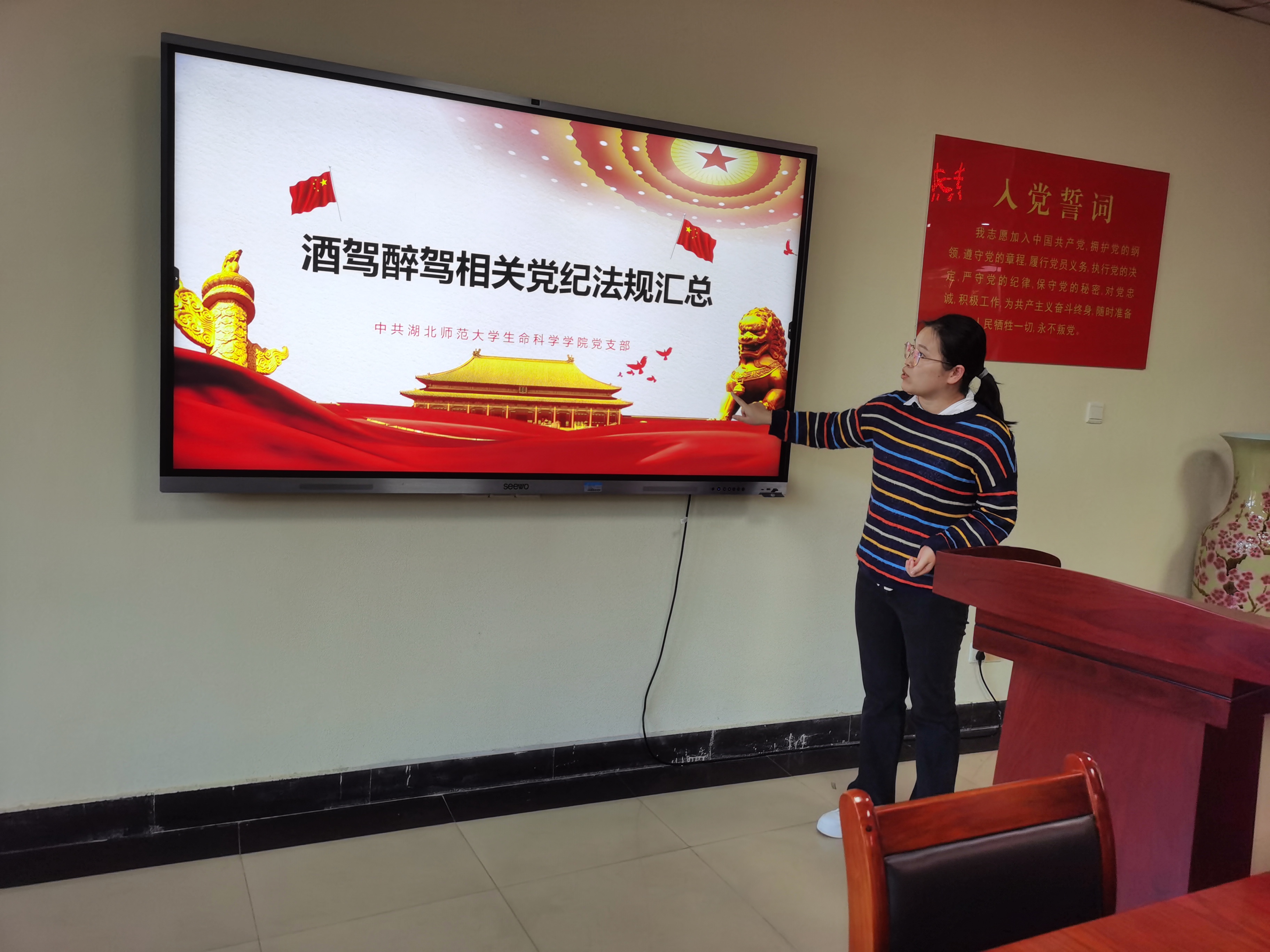 根据学校党委的部署,本次主题党日还重点开展了“推进党纪学习教育常态化长效化,从严从实从细推进酒驾醉驾警示教育”,支立峰传达了学校关于开展酒驾醉驾警示教育相关文件精神,纪检委员刘娜向全体党员讲解了“酒驾醉驾相关党纪法规”知识,强调酒驾醉驾是严重的交通违法犯罪行为,社会危害性大。全体党员干部和教职员工要严格自律,牢记“喝酒不开车,开车不喝酒”。