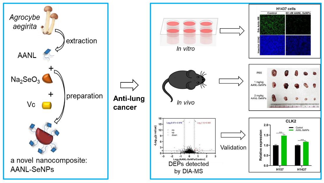 由于肿瘤的异质性,肺癌患者的五年生存率仍旧较低,筛选新的安全高效的抗肿瘤药物、提高患者生存率是一个重要研究方向。本研究用茶树菇中天然活性蛋白AANL修饰纳米硒,经氧化还原反应,制备了稳定的纳米硒组合物AANL-SeNPs,通过扫描电镜、透射电镜、马尔文粒径仪、红外光谱等方法表征了纳米组合物,并在细胞和动物水平上探究了AANL-SeNPs的抗肺癌活性。实验结果表明,AANL-SeNPs改善了Se在水溶液中的稳定性,对正常细胞无毒。AAGL-SeNPs可以抑制A549、H157和H1437三种肺癌细胞增殖和迁移,增强奥希替尼对肺癌细胞的敏感性;体内实验发现,AAGL-SeNPs抑制荷瘤小鼠肿瘤的生长;DIA-MS蛋白质组学检测分析及验证实验发现AAGL-SeNPs通过上调CLK2表达从而抑制肺癌发生。