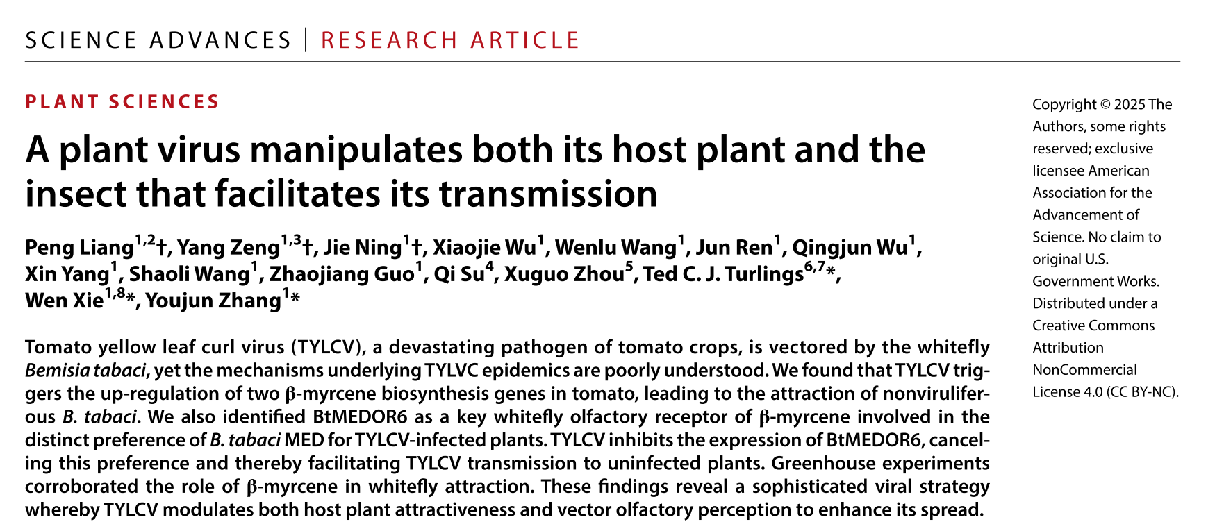 Peng Liang1,2†, Yang Zeng1,3†, Jie Ning1†, Xiaojie Wu1, Wenlu Wang1, Jun Ren1, Qingjun Wu1, Xin Yang1, Shaoli Wang1, Zhaojiang Guo1, Qi Su4, Xuguo Zhou5, Ted C. J. Turlings6,7*, Wen Xie1,8*, Youjun Zhang1*. A plant virus manipulates both its host plant and the insect that facilitates its transmission. Science Advances 11(9): eadr4563 (2025).