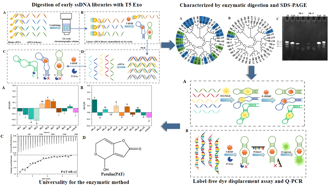 本研究开发了一种从早期筛选文库中快速鉴定高亲和力核酸适配体的新方法,旨在减少小分子核酸适配体筛选时间,降低筛选成本。利用T5外切酶酶切特性对5-羟甲基糠醛(5-HMF)筛选的第9轮、13轮、18轮文库酶切,随后对酶切前、后的文库高通量测序,并选取出现频次最高的20条适配体使用酶切电泳法、无标记荧光染料置换法以及Q-PCR表征适配体亲和力。酶切电泳结果表明,酶切库中亲和型适配体数量总是普通筛选库的两倍,当降低5-HMF浓度再次酶切,仍然能够得到相似的结果。无标记荧光染料置换实验和Q-PCR结果表明,第9轮酶切库中的9R-e1具有最高的响应值,这暗示着9R-e1具有高亲和力。使用ITC测定候选适配体亲和力大小,其中9R-e1具有最高的亲和力,其亲和力常数(Kd)为8.8±1.36 μM。为了验证方法的普适性,使用酶切法对展青霉素(PAT)的第6轮筛选文库酶切,并使用无标记荧光染料置换实验和ITC表征候选适配体亲和力。与5-HMF早期文库酶切结果类似,酶切库中亲和型适配体总是多于普通筛选库,且在第6轮酶切库中发现PAT-6R-e1具有高亲和力,其亲和力常数(Kd)为6.40±4.35 µM。本研究报道了一种快速从早期筛选文库中鉴定亲和力适配体的方法,促进高亲和力适配体的发现,提高Capture-SELEX的筛选效率,降低筛选成本。