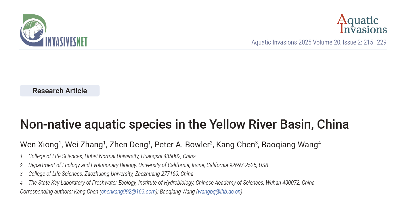近日,我院熊文博士与中国科学院水生生物研究所、枣庄学院、美国加州大学尔湾分校等多家单位合作在国际期刊Aquatic Invasions (中科院3区期刊)发表研究论文《Non-native aquatic species in the Yellow River Basin, China》。熊文博士为第一作者,本院研究生张伟、本科生邓甄为共同作者。