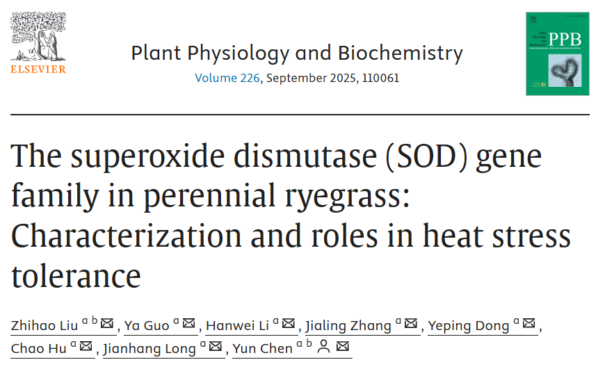 本网讯(通讯员 陈云)近日,我院刘致浩博士在国际期刊Plant Physiology and Biochemistry (JCR 1区,中科院2区Top期刊,IF:6.1)在线发表题为《The Superoxide Dismutase (SOD) Gene Family in Perennial Ryegrass: Characterization and Roles in Heat Stress Tolerance》的研究论文。刘致浩博士为第一作者,陈云副教授为通讯作者,我院食用野生植物保育与利用湖北省重点实验室、特色野菜良种繁育与利用技术湖北省工程研究中心为独立通讯单位。
