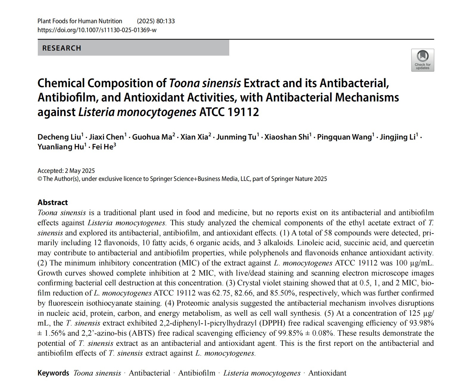 本网讯(通讯员 夏险)近日,我院天然产物发掘与综合利用团队联合湖北省疾控中心和黄石市第二人民医院在SCI期刊《Plant Foods for Human Nutrition》发表论文“Chemical Composition of Toona sinensis Extract and its Antibacterial, Antibiofilm, and Antioxidant Activities, with Antibacterial Mechanisms against Listeria monocytogenes ATCC 19112”。6686体育为第一单位,我院21级本科生刘德成和24级研究生陈佳茜为共同一作,夏险副教授为共同通讯作者。