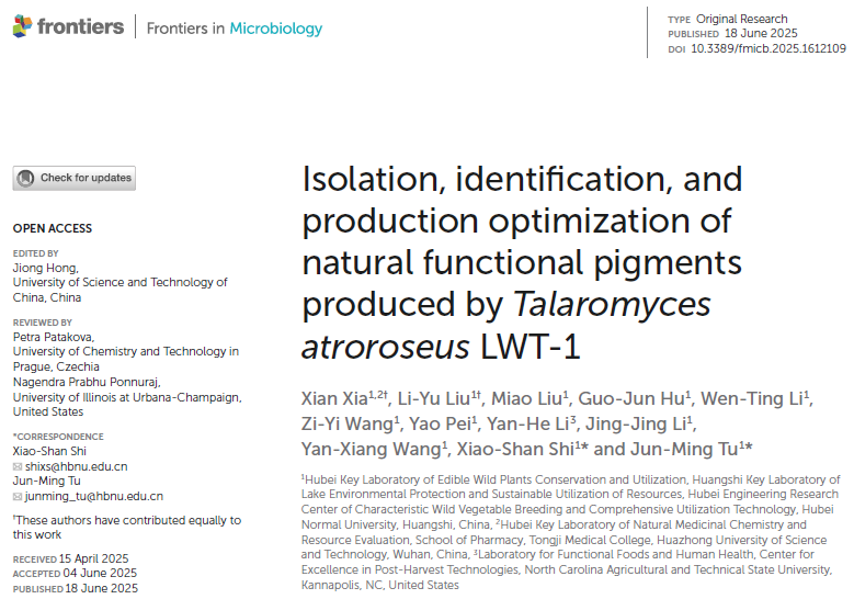 本网讯(通讯员 石小杉)近日,天然产物发掘与综合利用团队在SCI期刊《Frontiers in Microbiology》发表论文“Isolation, identification, and production optimization of natural functional pigments produced by Talaromyces atroroseus LWT-1”。6686体育为第一通讯单位,夏险副教授和23级研究生刘丽雨为共同第一作者,石小杉副教授和涂俊铭教授为共同通讯作者。