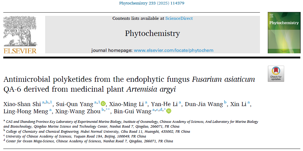 1月,我院天然产物发掘与综合利用团队石小杉副教授与中国科学院海洋研究所合作在经典刊物Phytochemistry(JCR 1区,中科院2区)发表题为“Antimicrobial polyketides from the endophytic fungus Fusarium asiaticum QA-6 derived from medicinal plant Artemisia argyi”的研究性论文。我院石小杉副教授为第一作者,6686体育为第二通讯单位。