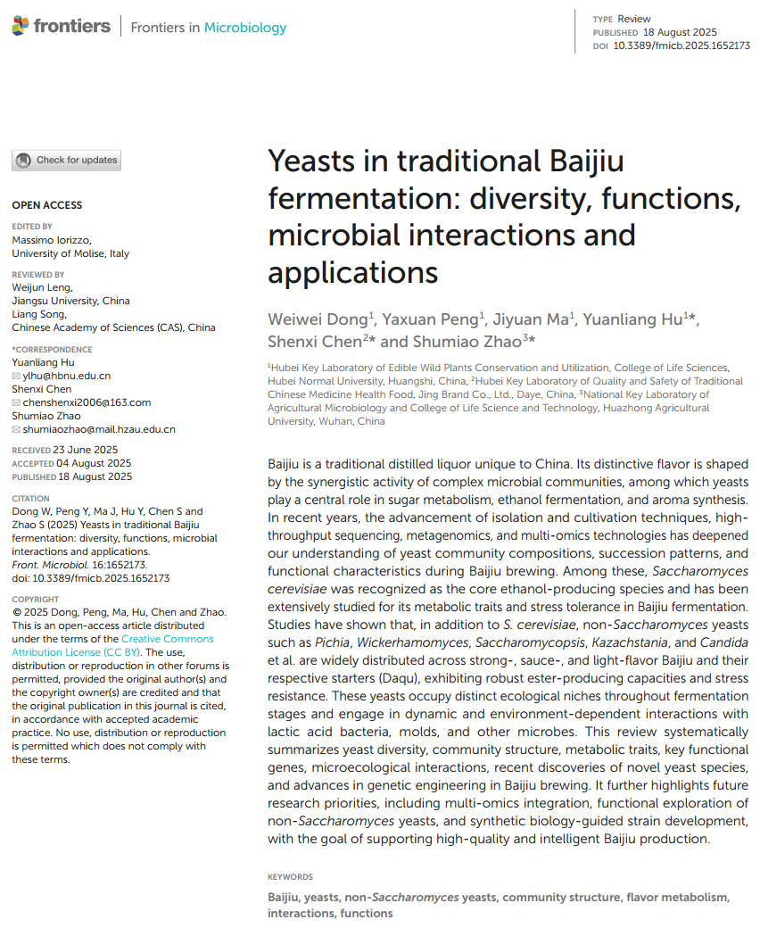 本网讯(通讯员 董卫卫)近日,微生物资源挖掘与利用课题组董卫卫博士在SCI期刊《Frontiers in Microbiology》(中科院2区)发表题为 “Yeasts in traditional Baijiu fermentation: diversity, functions, microbial interactions and applications” 的综述文章。我院董卫卫博士为第一作者,研究生彭雅旋、马纪园为共同作者,我院胡远亮教授与劲牌有限公司陈申习教授级高级工程师和华中农业大学赵述淼教授为共同通讯作者。我院食用野生植物保育与利用湖北省重点实验室为第一通讯单位。