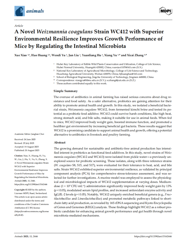 本网讯(通讯员 余翔)2025年8月,SCI期刊《Animals》(中科院2区)发表我院余翔博士的最新研究成果。论文题为“A Novel Weizmannia coagulans Strain WC412 with Superior Environmental Resilience Improves Growth Performance of Mice by Regulating the Intestinal Microbiota”。我院研究生肖雪和华中农业大学博士研究生黄昊为共同第一作者,余翔博士和荆楚理工学院张喜才博士为共同通讯作者,我院食用野生植物保育与利用湖北省重点实验室为第一通讯单位。
