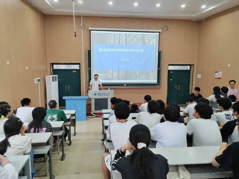 (通讯员 冯艳丽)2025年9月25日,黄石市蓝图生物科技有限公司董事长陈俊雄应邀为生物医药与大健康现代产业学院师生带来题为“蛋白质组学时代的靶向免疫检测行业介绍”的专题讲座。6686副院长李刚华、产业学院执行院长冯艳丽、产业学院副院长吴琴及相关课程负责人参与了本次活动。