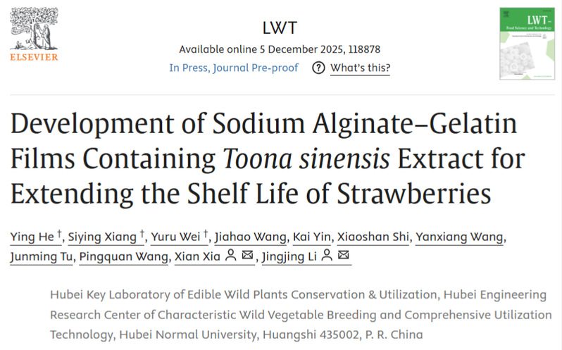(通讯员 夏险)近日,我院天然产物发掘与综合利用团队在一区TOP期刊《LWT - Food Science and Technology》上发表论文。本科生何莹、向思颖和已毕业研究生魏钰茹为共同一作,本科生王佳昊为参与作者,夏险和李京京副教授为共同通讯作者。