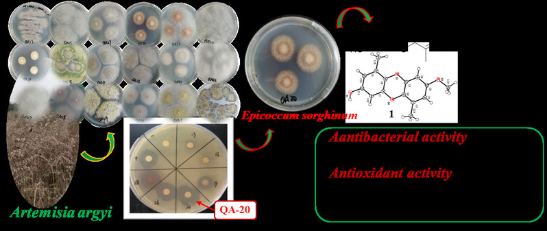 艾(Artemisia argyi)是我国传统药用植物,蕲春“蕲艾”更为国家地理标志性产品,具有重要的药用与经济价值。本研究从蕲艾中共分离获得40株内生真菌,经过发酵筛选,发现一株内生真菌——高粱附球菌Epicoccum sorghum QA-20对多株水产病原菌具有显著的抑制活性,通过大规模发酵,色谱分离和波谱技术,共从中分离鉴定出1个结构新颖的聚酮类化合物以及12个已知化合物,新化合物通过X-射线单晶衍射确定了其绝对构型。在生物活性测试中,化合物6对全部7种测试水产病原菌均表现出抑制效果(MIC = 12.5–100 μg/mL),显示出广谱抗菌潜力,化合物7则具有与维生素C相当的抗氧化能力。该研究从蕲艾内生真菌中发掘出兼具抗菌与抗氧化活性的天然产物,为开发绿色病害防控制剂与天然抗氧化剂提供了新的候选分子与资源依据。