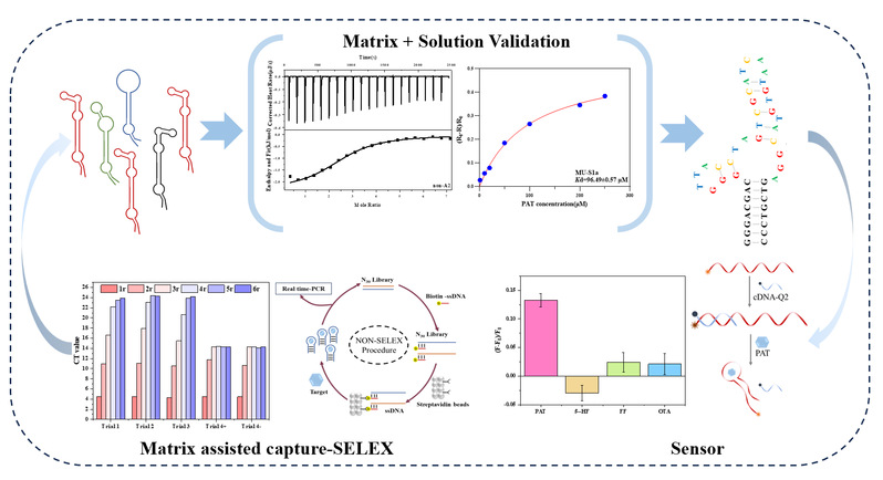 该研究提出了一种“基质辅助capture-SELEX”新策略,旨在筛选能够耐受复杂基质干扰的核酸适配体,并以筛选苹果汁中展青霉素(PAT)适配体为例进行了策略验证。筛选过程在由苹果汁配制的matrix-SELEX缓冲液体系中完成。随后,利用等温滴定量热法(ITC)在100%基质环境中直接测定了所得适配体的结合亲和力,并采用脲酶法分析确定了基质耐受型适配体的关键区域。基于筛选出的基质耐受型适配体,研究构建了一种基质耐受性荧光传感器,并在多种市售商业苹果汁基质中评估了其性能。