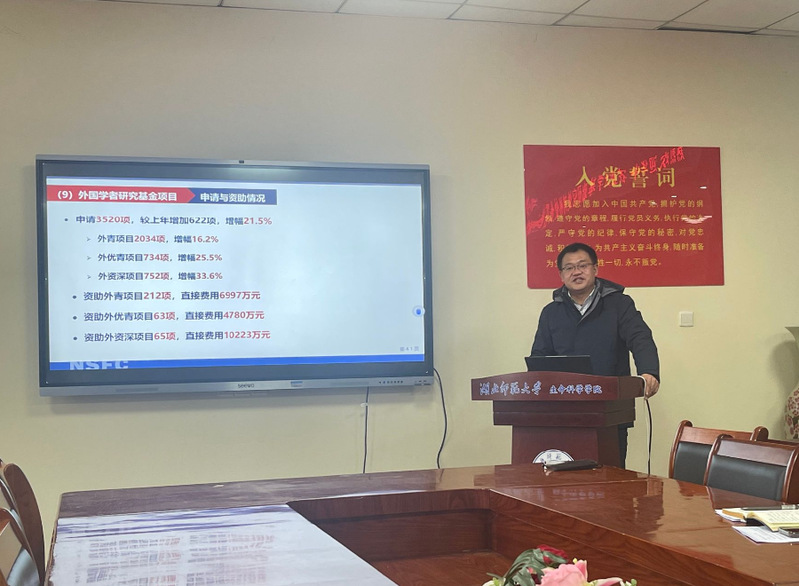 (通讯员 彭千芮)为准确把握国家自然科学基金政策动向,提升项目申报质量,2026年1月21日下午,我院特邀华中农业大学基础研究处刘彬处长作专题报告。报告会由胡远亮院长主持,校科学研究发展院院长唐兴军、副院长李刚华、刘细霞及学院相关教师参加。