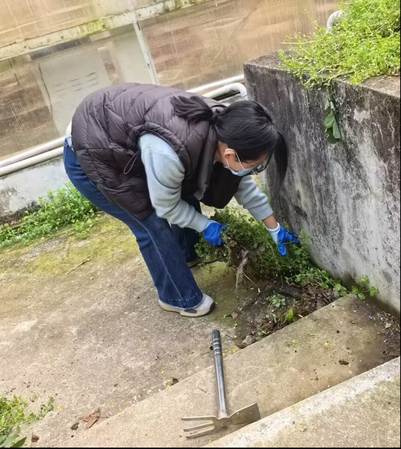 活动由学院党员领导班子带头参与,学院党委书记刘洋、副院长刘细霞以普通党员身份参加活动,与支部党员一同投入劳动。下午3时,全体参与党员准时在生物园入口集合。支部书记及支部委员们率先垂范,现场明确分工并分发劳动工具。本次活动共组织约17名党员教师参与,分为两个小组开展劳动。第一小组由刘娜任组长,负责生物园入口台阶至旋转楼梯及凉亭区域;第二小组由吴琴任组长,负责501-511房檐及中间露台区域。