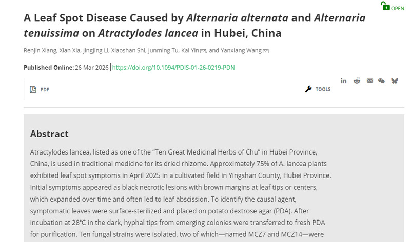 2026年3月,6686体育6686天然产物发掘与综合利用团队在国际植物病理学期刊《Plant Disease》(中科院2区,IF5-years=4.8)上发表题为 “A Leaf Spot Disease Caused by Alternaria alternata and Alternaria tenuissima on Atractylodes lancea in Hubei, China” 的研究短讯。6686体育为第一通讯单位,25级研究生向任锦为第一作者,尹凯博士与王雁翔博士为共同通讯作者。