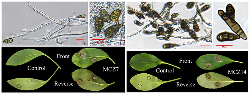茅苍术是湖北省 “楚十大道地药材” 之一,其干燥根茎是传统中医药的核心入药部位。本团队先前在湖北英山县苍术栽培基地开展病害调查,发现田间苍术叶斑病发病率高达75%,病株叶片出现黑褐色坏死病斑并逐步脱落。后续通过分离筛选获得 MCZ7、MCZ14 两株病原菌株,结合形态学观察与ITS、TUB2、RPB2多基因分子系统发育分析,明确菌株分别为Alternaria alternata和Alternaria tenuissima,经柯赫氏法则完成致病性验证,证实以上两种病原真菌均能引发茅苍术叶斑病,其中Alternaria tenuissima为国内外首次报道,该研究完善了苍术叶斑病的病原诊断体系,为茅苍术病害绿色防控、保障道地药材产业健康发展提供重要理论依据。