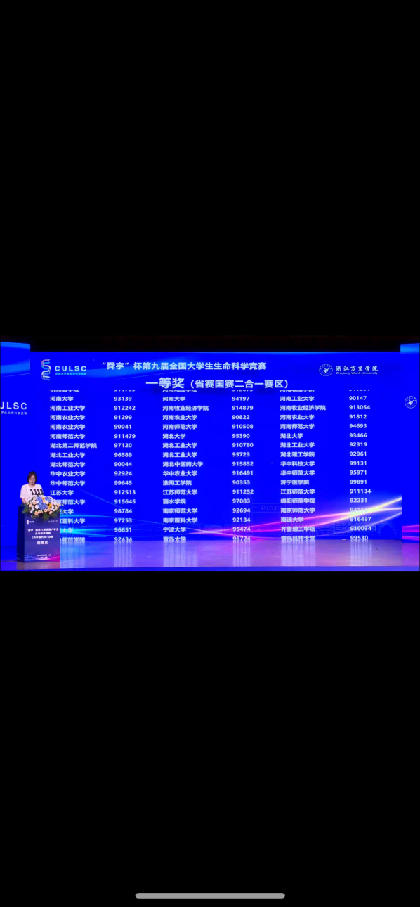 本网讯(通讯员 孙逸雯)近日,第九届全国大学生生命科学竞赛(科学探究类)决赛和湖北省赛区决赛分别在国赛承办单位浙江万里学院和省赛承办单位湖北工业大学举办。湖北省赛区首次采取国省二合一的比赛形式,吸引了来自全省36所高校的915支团队报名参赛,经网络评审,共有92支队伍入围国省二合一决赛现场答辩。经过PPT展示、选手答辩、专家提问等环节,我校最终荣获国家级奖项6项,包括一等奖1项、二等奖1项、三等奖4项。并获得省级奖项16项,包括省级一等奖4项、二等奖7项、三等奖5项。同时,我校获得优秀组织奖。本次竞赛我校入围决赛队伍获奖比例、数量和质量创历史新高。
