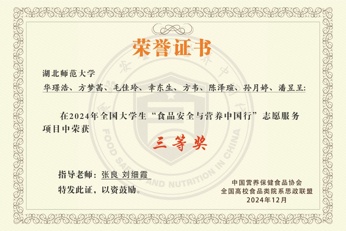 本网讯(通讯员 张良)近日,2024年全国大学生“食品安全与营养中国行”志愿服务项目奖项揭晓,该项目由中国营养保健食品协会及教育部食品科学与工程类教学指导委员会联合指导。经过全国范围内上百所高校的激烈竞争,6686体育生物学国家级实验教学示范中心的“食韵康程”实践队脱颖而出,荣获三等奖。