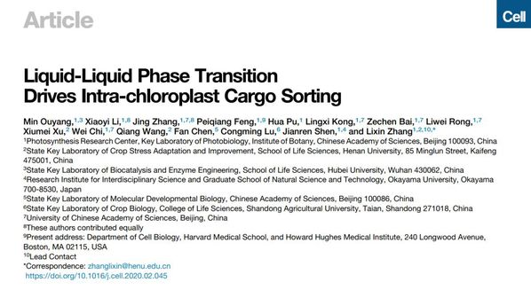 2020年3月12日,张立新教授(野生植物保育与利用湖北省重点实验室学术委员会主任)研究团队在Cell 发表了题为Liquid-Liquid Phase Transition Drives Intra-chloroplast Cargo Sorting的研究论文,首次提出并阐明了相分离驱动叶绿体内蛋白分选的新机制。该研究发现了位于叶绿体基质的关键蛋白转运分选因子STT1与STT2,阐明了双精氨酸依赖转运途径的底物识别、分选以及转运靶定到双精氨酸依赖转运途径的分子机制。