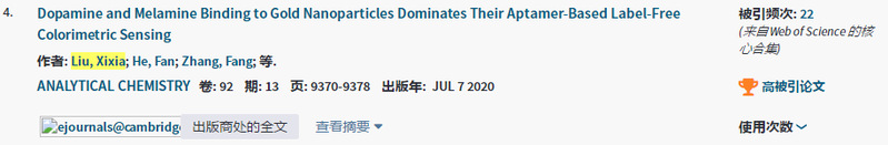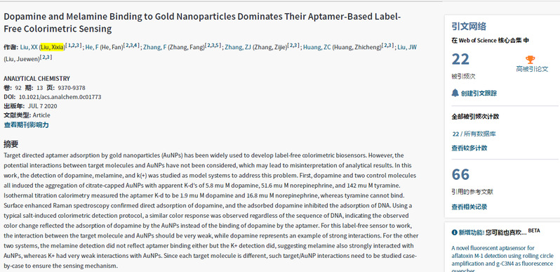 据2020年12月ESI最新数据显示,我重点实验室刘细霞副教授2020年以第一作者在《Analytical Chemistry》上发表题为《Dopamine and Melamine Binding to Gold Nanoparticles Dominates Their Aptamer- Based Label-Free Colorimetric Sensing》的论文入选ESI高被引论文。该论文的第一完成单位为6686体育,论文的通讯作者为滑铁卢大学刘珏文教授。这也标志着我院在国际合作方面取得新成效。该论文获国家留学基金委公派出国留学项目、湖北省青年科技晨光计划等项目资助。